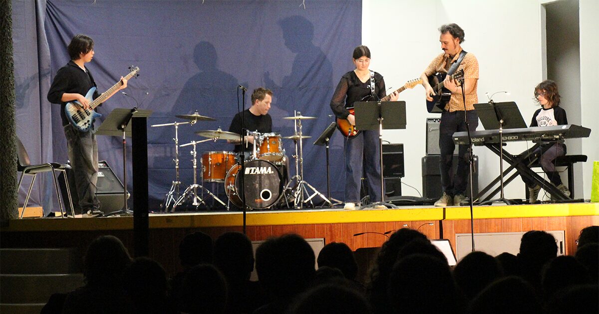 jeunes élèves en batterie et guitare électrique sur scène